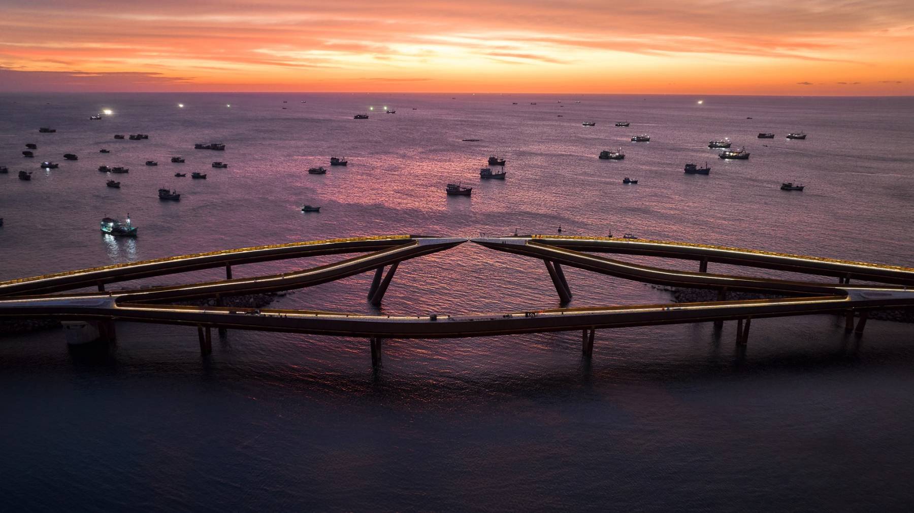 키스 브릿지(Kiss Bridge)는 특히 푸꾸옥 남부 섬과 베트남 관광 전반의 새로운 상징입니다. 총 길이가 800m에 달하는 키스 브릿지는 북쪽과 남쪽 두 개의 가지가 하나로 통일되어 있지만 30cm 간격으로 닿지는 않으므로 포옹, 악수, 키스를 하기 딱 좋습니다. 치밀하게 계산되어 매년 1월 1일 일몰이 두 교두보 사이에 바로 떨어지는 이 거리는 세계에서 일몰을 감상할 수 있는 가장 아름다운 장소 중의 하나입니다.